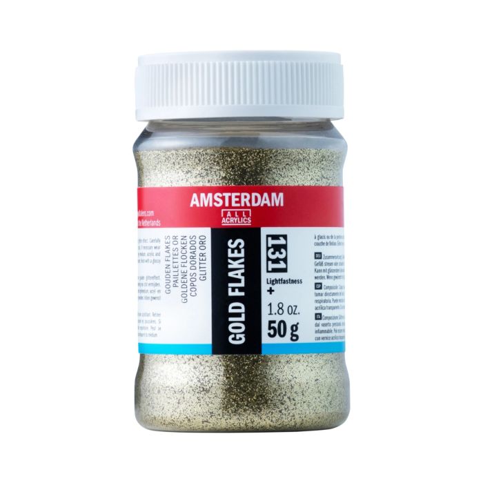 Add some sparkle to your work with Amsterdam glitter flakes! Mix them with gloss mediums (such as acrylic, glazing or gel), transparent paints or use them on top of wet paint. Matt mediums and varnishes will dull the sparkle effect. Amsterdam flakes are available in multi-color (holographic), black, silver and gold.