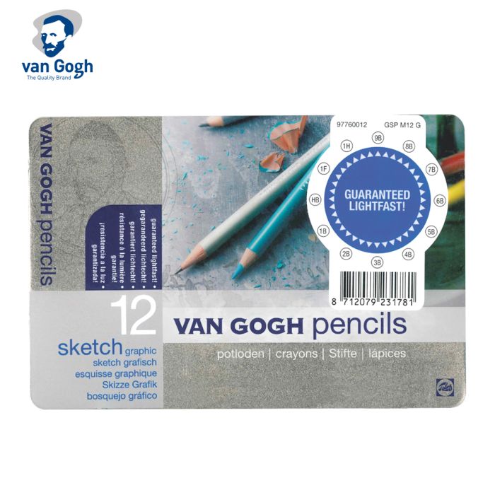 Artist quality pencils for sketching and drawing, both in studies or final artwork. These Van Gogh pencils are lightfast rated. The barrels are made from responsibly forested cedar wood; a soft wood that is easy to sharpen. This 12-piece specialties tin set includes a variety of pencils for sketching and drawing. Included in this set are 1 each of the following sketch pencils: aqua soft (water soluble), aqua medium (water soluble), charcoal soft, sanguine, sepia dark, sepia light, white, yellow ochre, raw sienna, light oxide red, burnt sienna, and caput mortuum red.