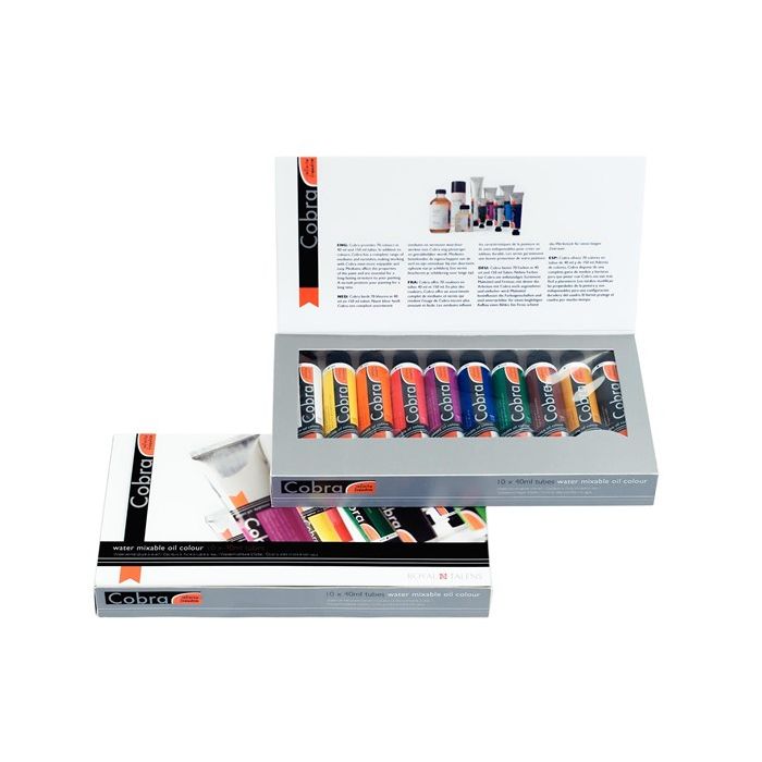 This convenient set contains 10 different colours of Cobra Artist oil colours in tubes of 40 ml. Contents: 10 x 40 ml (Titanium White 105 – Permanent Yellow Light 283 – Permanent Orange 266 – Pyrrole Red 315 – Permanent Red Violet Light 577 - Ultramarine 504 – Permanent Green Deep 619 – Burnt Sienna 411 – Yellow Ochre 227 – Ivory Black 701).
