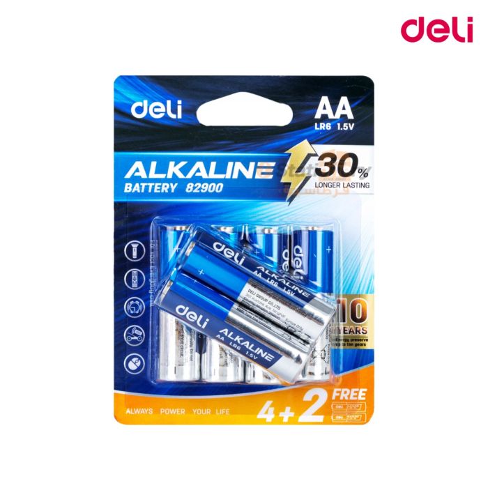 The Alkaline Battery AA LR6 (Pack of 4 + 2 Free pcs) Deli - 82900 is a set of reliable AAA size alkaline batteries, designed to provide long-lasting power for a variety of devices. These batteries are ideal for use in remote controls, toys, flashlights, and other small electronic gadgets. The pack contains four batteries, ensuring you have a backup supply when needed. Known for their high performance and longevity, these batteries are a great choice for everyday use.