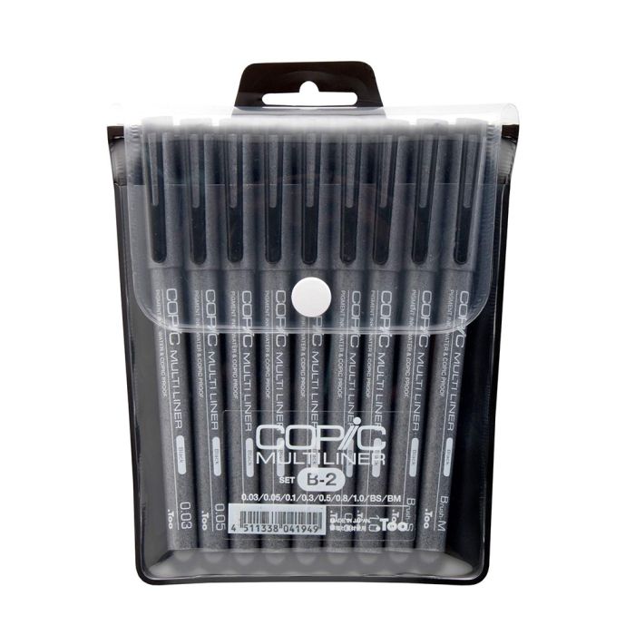 COPIC Multiliners are permanent, waterproof pigment pens that will not bleed into COPIC markers. These precision drawing pens come in a variety of sizes as well as unique brush tips that offer a distinct line variation. They are ideal for scrapbooking, comic design and illustration.