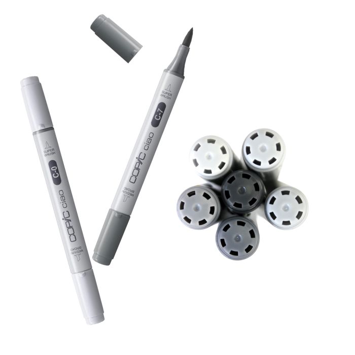 Copic Ciao markers are versatile double-ended refillable markers with fast-drying, permanent, nontoxic ink. Ciao are the perfect markers for beginners. They have the same ease of use and special features of the COPIC Sketch marker, with a super brush nib and a medium broad nib, yet it has a round barrel and comes in a convenient small size that makes it perfect for young artists. Both nibs are replaceable.