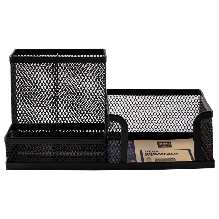 Deli E9175 mesh desk organizer. Durable mesh steel material. Flexible storage capacity to sort items clearly. Non-scratch edge design to protect hands and desktop. Hollowing out design with multi grids for drying and ventilation. Ideal for household, office & school.