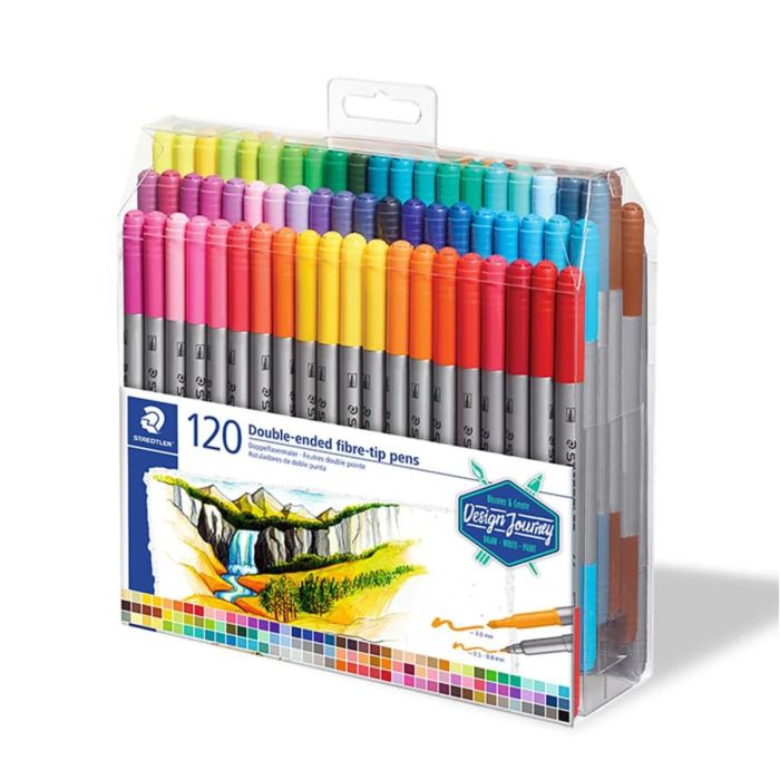 Double-ended fibre ti pens with two tips for narrow and broad strokes. Line widths 3mm and 0.5-0.8mm. Available in 120 colours. Ideal for sketching, drawing, illustration, writing and