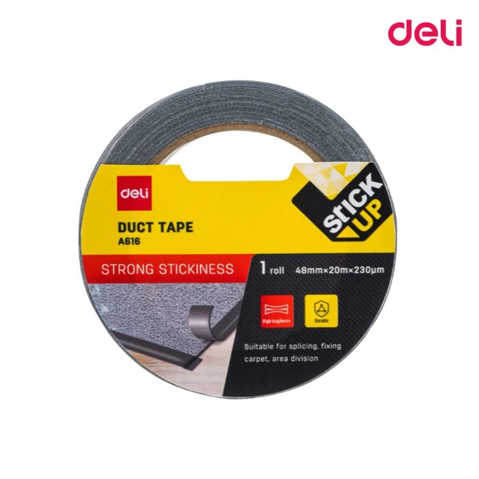 Deli A616 Black Duct Tape (48mm): A durable, multi-purpose adhesive tape with a 48mm width, ideal for repairs, sealing, bundling, and crafting. Strong adhesion, tear-resistant, and easy to apply on various surfaces. Suitable for both indoor and outdoor use.