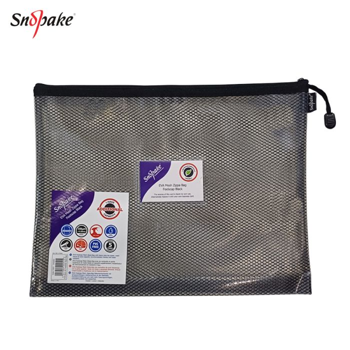 The Eva Mesh Zipper Bag DL Black HC SNOPAKE - 15881 is a DL-sized zipper bag made from durable mesh material, featuring a sleek black design with high-contrast accents. The mesh allows for easy visibility of the contents, while the zipper closure ensures that your items stay secure. Ideal for organizing documents, stationery, or small personal accessories, this bag is perfect for both professional and personal use. Its compact size and sturdy construction make it a reliable option for keeping your essentials organized and protected.