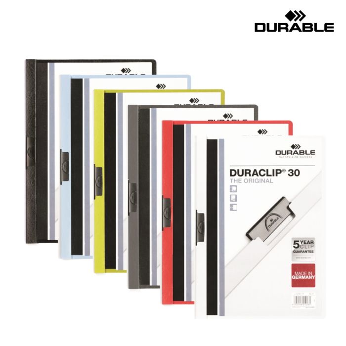 The Original DURACLIP File Made Of PVC Plastic With A Special Sprung Steel Clip. Ideal for Presentations, Filing, Quotations, Conference/Seminar Notes and Reports. The DURACLIP 30 Folder Has A Capacity Of 30 A4 Sheets, A Transparent Front Cover And Coloured Back And Spine.
