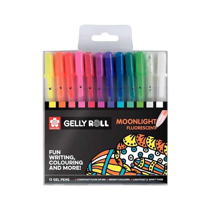 A unique collection of the 10 most beautifully coloured Moonlight gel pens, 1 Clear Stardust gel pen, and 1 Basic White gel pen. This set contains one piece of each bright coloured fluorescent Moonlight gel pen in the colour Fluorescent Yellow (403), Fluorescent Orange (405), Fluorescent Vermillion (418), Fluorescent Pink (420), Red (419), Rose (421), Purple (424), Blue (436), Green (429), Fluorescent Green (427), 1 Clear Stardust gel pen (700), and 1 Basic White gel pen (50). The Sakura Gelly Roll contains special water-based pigment gel ink to give bright, intense colours which never fade. Thanks to the unique gel ink technology, the ink flow from the pen is always constant, without exerting any pressure. Moonlight writes well on white but really comes to life on black paper. Special effect with blacklight! Gelly Roll Moonlight® has the brightest and most vivid colours of the Gelly Roll® family. The creamy, smooth, opaque ink is perfect for drawing, doodling and colouring. All colours are bright on white paper and produce outstanding effects on black paper, and the fluorescents will glow under a black light source.. 8712079395711 / POXPGBMOO12