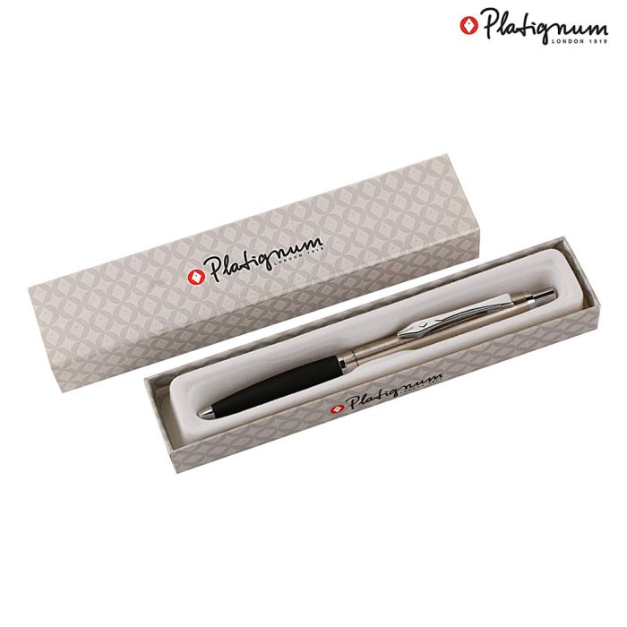 The Platignum 'Time' Black/GunMetal Fountain Pen with Blue Ink in Silver GiftBox - Ref: 50285 Since 1919, when we began making Writing Instruments in Britain, we've been writing the history of the pen. Platignum TIME conveys strength and quality for those who appreciate detail and 21st Century design. The brass barrel and cap are lightweight and provide the pen with perfect balance and weight. Then click on/off cap allows secure protection of the nib when not in use. The Time range possesses a sophisticated harmony that is synonymous with achievement and distinction. Its uniqueness lies in its balanced style and classic dimensions. Ideal for everyday use or as an unforgettable gift for someone special.