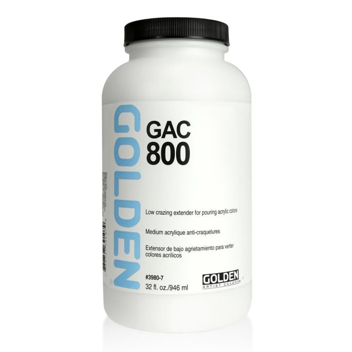 GAC 800 is a low-crazing extender for pouring acrylic colors. "Crazing" is the formation crevices in surfaces that develop as acrylic paints and mediums dry. The addition of GAC 800 promotes drying with a smooth, even film, good gloss and flexibility, but with moderate clarity. GAC 800 is also useful for adhesion to chalky surfaces.