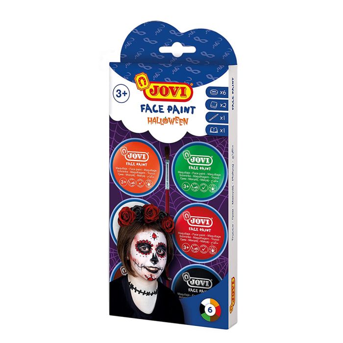 Jovi Cream Face Paint :The JOVI Face Paint cream make-up is very easy to apply with fingers, a sponge or a paintbrush without needing to use water. Has a great coverage capacity, excellent quality and a smooth texture. It is suitable for children of 3 years and above, and can also be mixed together to create new colours. Not to mention, it dries quickly without leaving a greasy feeling. Does not contain parabens and is free of main allergens.Specification- Set of 6 bottles of 8 ml Assorted Colours more Halloween accessories- Contains two sponges, a brush and a brochure with makeup suggestions- Vivid colours and mezclables apart, soft texture and pleasant, do not dry- Easy to apply, removes easily with a cloth- Completely free of allergens and parabens