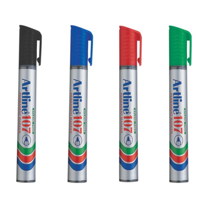 The Artline 107 plastic barrelled standard size permanent marker. Suitable for use on most surfaces including paper, cardboard, plastic, metal, glass etc. Instant Drying, Water Resistant ink. Handy Pocket size. Xylene-Free. Snap-fit airtight cap with pocket clip. Bullet Tip