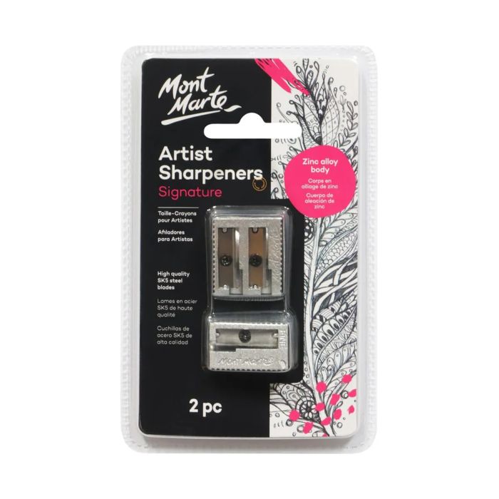 The Mont Marte Signature Artist Sharpeners set contains two zinc alloy sharpeners with finely honed SK5 steel blades. These sharpeners are great for when you are working in the studio or sketching outdoors. Both sharpeners have side grip for comfortable and easy handling. Pencils only need a few turns to get a sharp point.