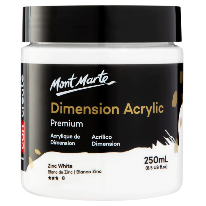 Mont Marte Premium Dimension Acrylic is a high viscosity fine art paint that offers artists a new dimension in painting. This acrylic's ultra thick consistency can be applied with brush, palette knife or shaper to create especially exaggerated texture effects.Dries hard and holds shape while still maintaining flexibility and smooth flow-ability. It can be diluted with water or acrylic mediums for glazing or watercolour techniques. With dilution, the pigment still holds strong colour intensity. Excellent lightfastness and premium quality pigment means colour strength will stay brilliant for longer. The series is available in a range of vivid colours which dry to a radiant gloss finish.