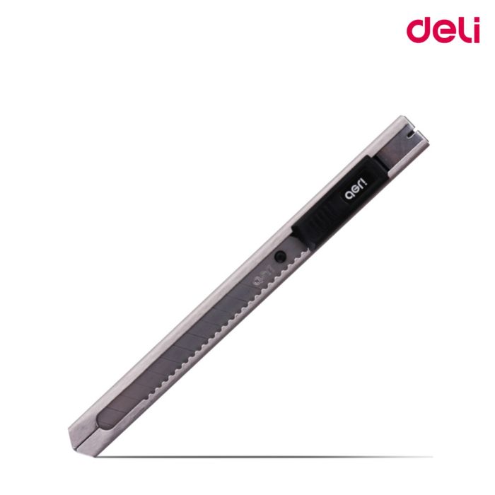 Deli Paper Cutter (Small, 2058): A compact and efficient paper cutter designed for precise cutting of paper, photos, or documents. It features a sturdy base, a sharp blade, and a safety guard for accurate and safe operation. Ideal for home, school, or office use, it can handle small-scale cutting tasks with ease. Lightweight and portable for added convenience. This is a utility knife from Deli, often referred to as a paper cutter or box cutter. It appears to be compact and sleek in design, featuring a retractable blade with a locking mechanism for precision and safety. This type of cutter is typically used for light-duty cutting tasks such as trimming paper, opening packages, or crafting