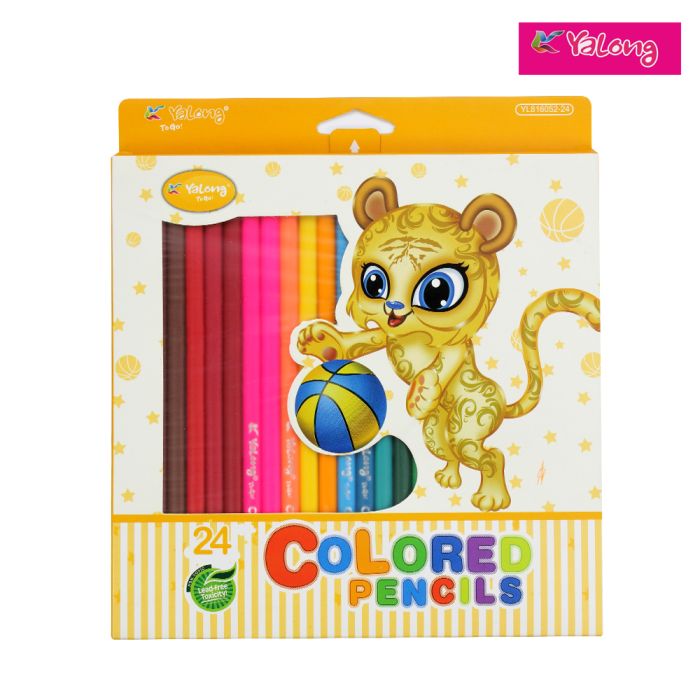 We present you three-sided coloured wooden pencils of Yalong 24 colours with gold drawing on the edge of the face. Cardboard packaging with Euro suspension, certified wood, environmental, very bright saturated colors. Easy to sharpen, do not crumble, ideal for kindergarten and school. Products comply with GOST and international environmental standards.