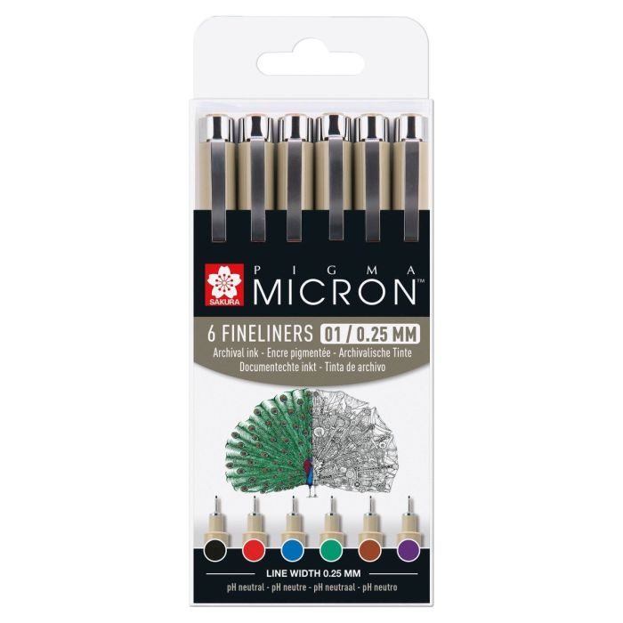 Set of 6 coloured Pigma Micron 05 0.45 mm fineliners. The fine tip makes this pen ideal for Drawing, Coloring, Illustrating both technical and artistic drawings. The plastic wallet contains one of the following coloured ink Pigma fineliner pens: Black (49), Red (19), Blue (36), Green (29), Brown (12), Purple (24). The unique sakura pigma™ ink will not bleed through paper, is permanent, waterproof, fade resistant, quick drying and pH-neutral.