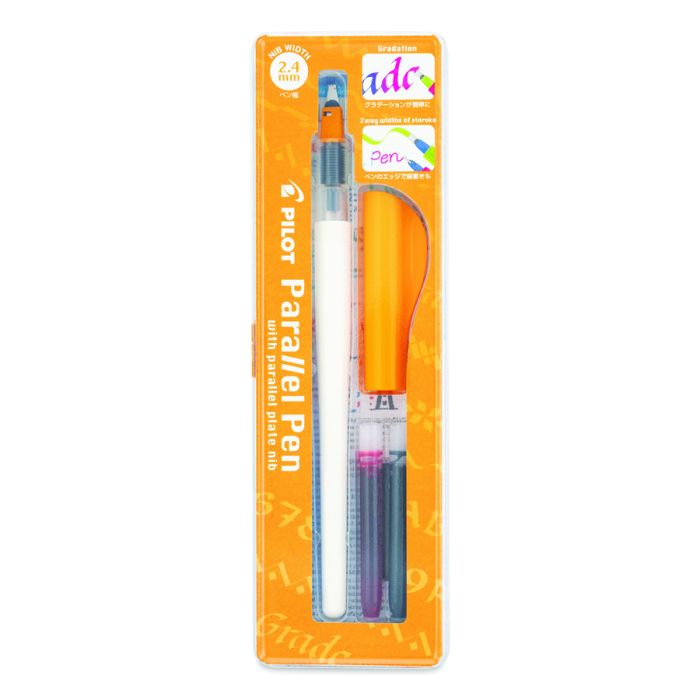 A breakthrough in calligraphy pen design, this pen features a nib that consists of two parallel plates, allowing the writer to produce lines sharper than existing calligraphy pens. Ink cartridges can be switched in the pen to create gradated color lines and mixed colors. Each set comes with a Parallel pen, one black and one red ink cartridge, a converter to clean the pen and a nib cleaner.