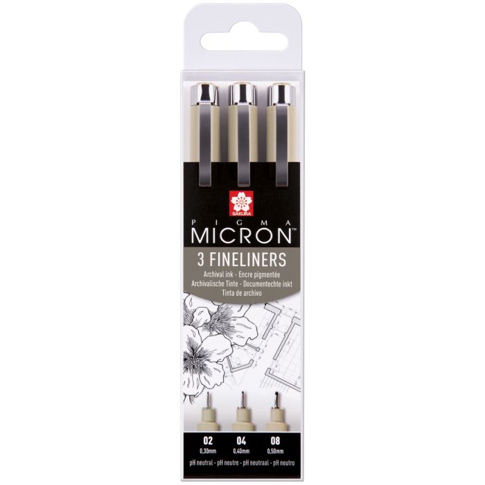 Selection of the thinnest black Pigma Micron pens. Sakura Pigma Color Technologies; Pigma was the first ink in the world to combine pigments and water. The fine tip makes this pen ideal for creating both technical and artistic drawings. Pigma Micron 005, 01 and 03.