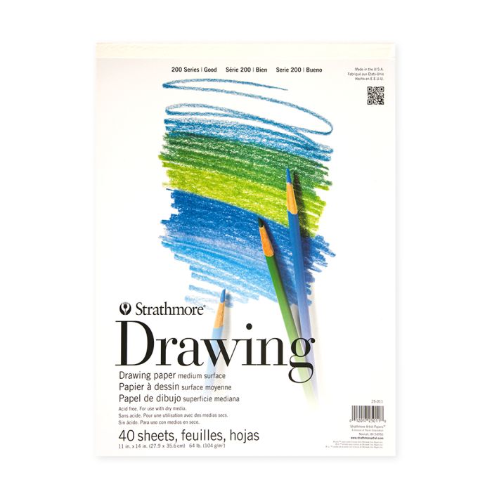 Strathmore 200 series drawing pad with 70 lb. basis weight quality paper is perfect for final artwork using pencil, pen and ink, charcoal and markers. Pad with tape bound top and contains 40 light-weight, acid-free sheets.
