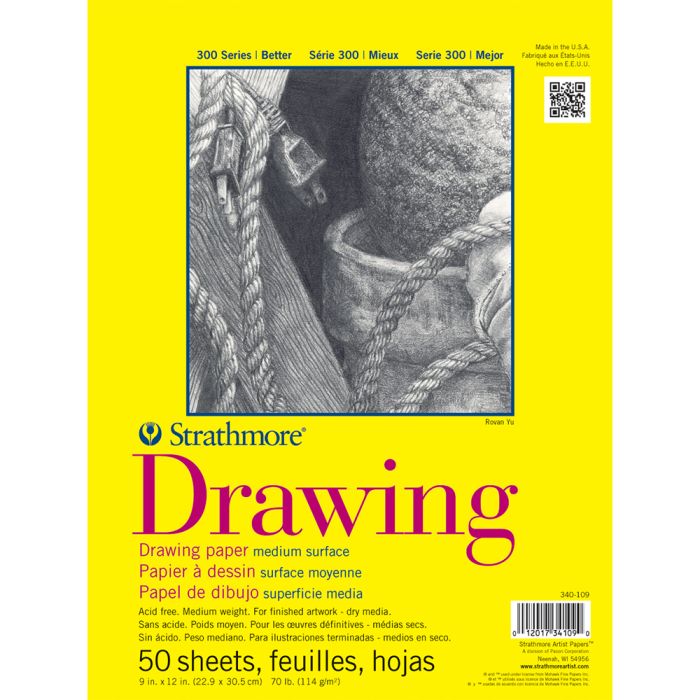 The Strathmore 300 Series Drawing Pad contains a medium weight student grade drawing paper perfect for artists of all levels. With a medium surface finish, this pad offers a surface that allows for good erasability with pencil and colored pencil and readily accepts charcoal and sketching sticks. The Strathmore 300 Series Drawing Pad is also rated good for marker, mixed media, soft pastel, and oil pastel.