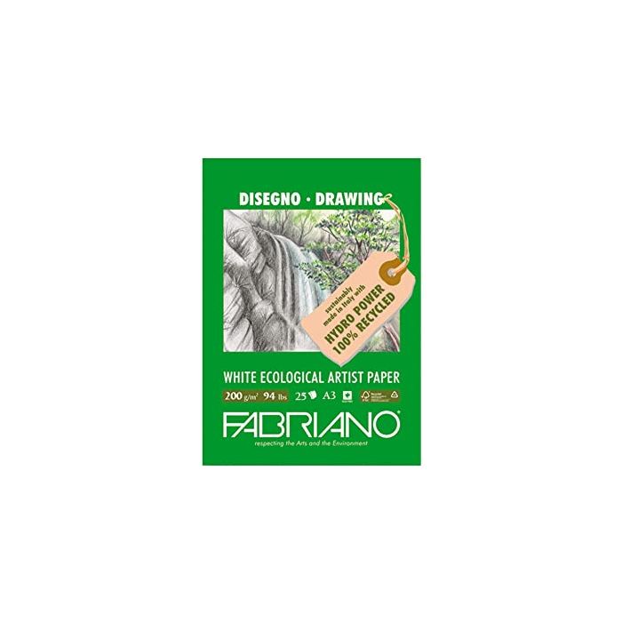 White ecological drawing paper, acid free, produced with 100% post consumer recycled pulp. Cold press surface very white in comparison with a common recycled paper. Its internal and external sizing makes it ideal for sketches and drawing with pencil, charcoal, pastel, coloured pencil and ink. The use of recycled pulp allows to save 15 trees every ton of paper produced (corresponding to 1.200 blocks).