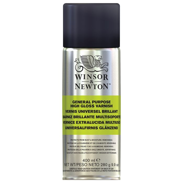 High Gloss Varnish - Winsor & Newton General Purpose High Gloss Spray Varnish protects oil paintings from dust, moisture and may be removed with Winsor & Newton's White/Mineral Spirit or Turpentine. This high gloss varnish is ideal for paper, wood, metal and modeling materials. Available in a 400 ml. can