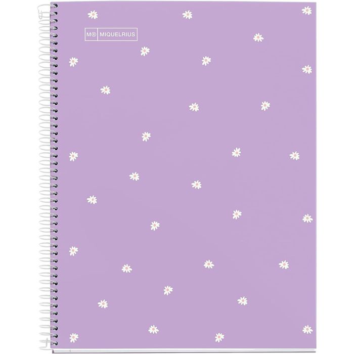 Miquelrius Notebook A4 (210 x 297 mm) Covers: Cardboard lined with matt laminate, compact and durable. Spiral: Continuous metal that allows the flat opening of the notebook, in addition to full turning, and with coilock closure that prevents snags. Inner paper: extra opaque 90gsm prevents ink from bleeding and dries quickly. Sheets: 80 sheets with 1 color band on the side, ideal for classifying notes and using a color for each subject; header for titles; micro-perforated for a clean start and 4 holes for filing. Striped: Horizontal 7 mm.