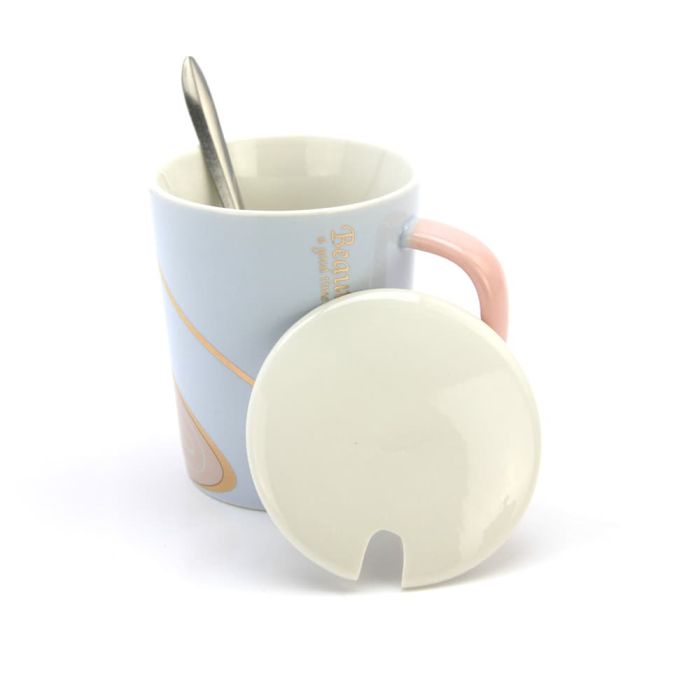 Ceramic Coffee or Tea Mug with Handle, Lid and with Spoon - Beauty