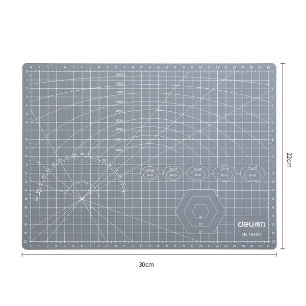 Features:A4 cutting matDouble-sided clear scalesRepeated cuttingSelf healingSpecifications:Product Name: Cutting MatBrand: DeliModel: 78400Material: PVCColor: GreenSize: A4, 305 x 225 x 3mmPackage includes:1 X Cutting Mat