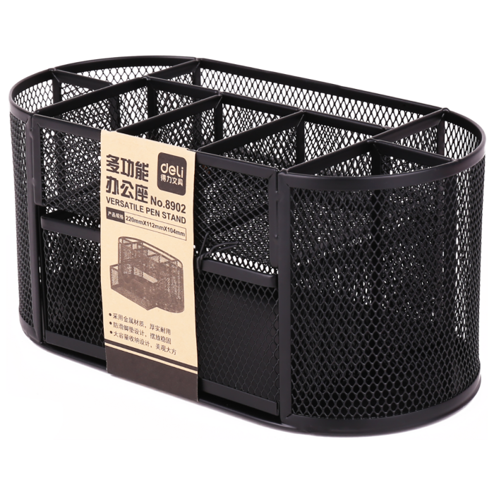 Deli one-stop storage desk organizers, convenient and flexible to use. Meshed metal material is compatible to various kinds of workplace, household and study organizing. Three asymmetric compartments are design specifically for holding pens, notepads/sticky notes and other office consumables. Lid-free and mesh metal design give barrier-free observation of stored contents.