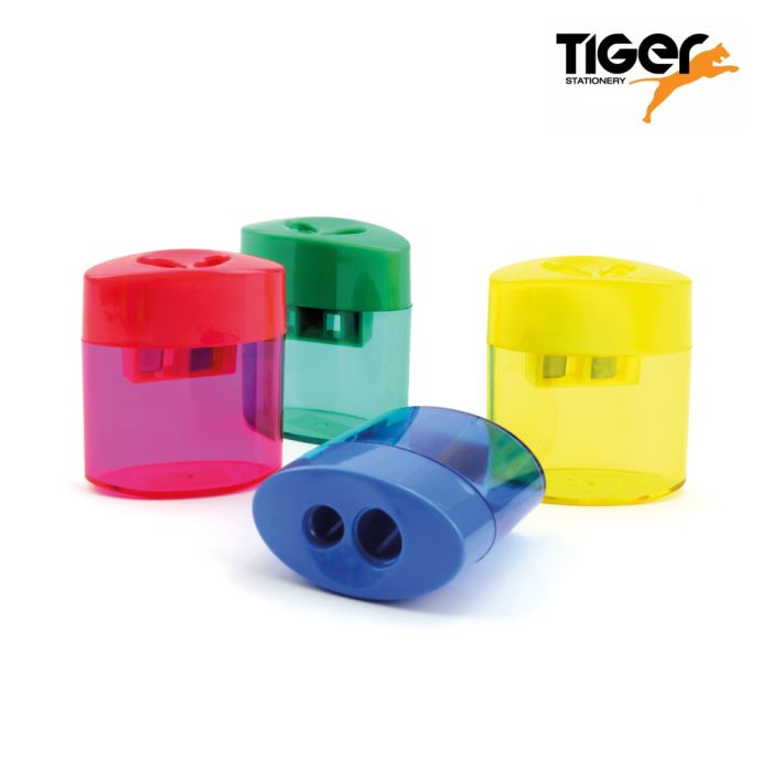 These sharpeners have 2 different sized holes. They can be used with pencils and crayons and come with an attached plastic shavings holder. Available in assorted colours