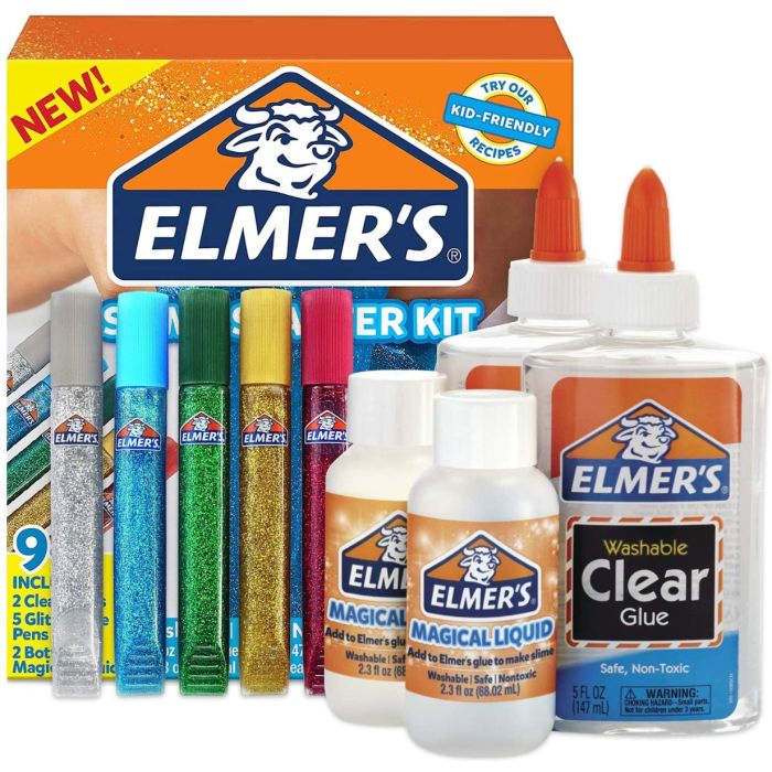 Elmer's Slime Starter Kit, 9 Count Everything You Need to Make Custom Slime: Clear Glue, Glitter Glue Pens & Magical Liquid It's time for hours of fun with slime thanks to the Elmer’s Glue Slime Starter Pack! Loaded with two types of washable, safe and nontoxic glue plus Elmer's Magical Liquid Activator Solution, it’s your ticket to endless family fun. The kit includes two bottles of clear glue that forms the ideal transparent slime base to customize with color plus five glitter glue pens that add explosive personality to your slime. Simply mix the glue with the Magical Liquid for hours of fun.