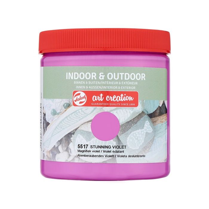 Indoor & Outdoor 250 ml Stunning Violet (5517) 423655170 A satin gloss universal paint with a good covering power, for both inside and outside the house. Suitable for almost any surface; zinc, wood, terracotta, paper, plaster, plastic e.g. This makes applications possible such as decorating bird houses and flower pots. Make sure the surface is clean, dry and grease free. Drying time: 30 min. Water-resistant and outdoor exposure only after 24 hours of drying.