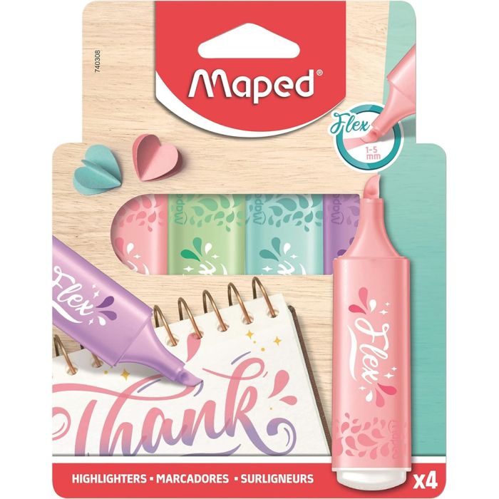 Introducing the Maped - 4 Flex Pastel Highlighters, the perfect addition to your stationery collection. These highlighters are designed to bring vibrancy and efficiency to your note-taking, highlighting important information in a visually appealing manner. With their flexible tips and pastel colors, these highlighters make studying, organizing, and marking documents a breeze.