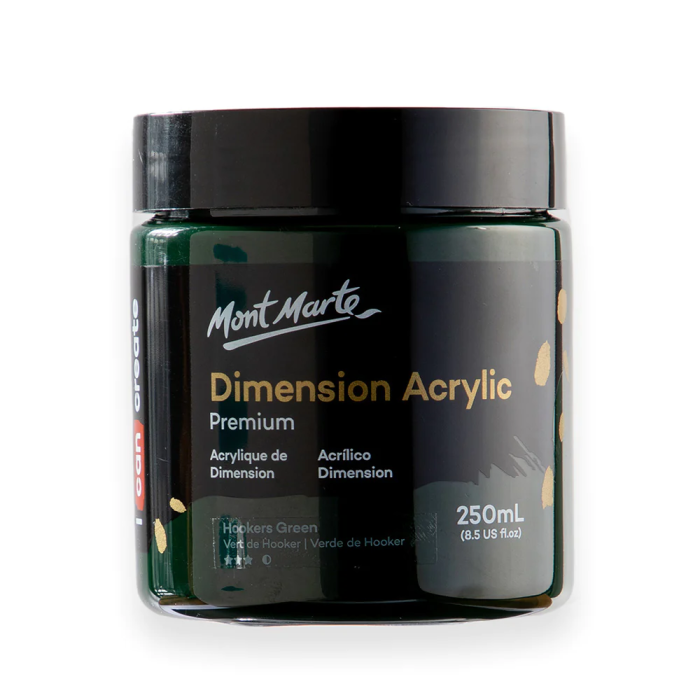 Mont Marte Premium Dimension Acrylic is a high viscosity fine art paint that offers artists a new dimension in painting. This acrylic's ultra thick consistency can be applied with brush, palette knife or shaper to create especially exaggerated texture effects.Dries hard and holds shape while still maintaining flexibility and smooth flow-ability. It can be diluted with water or acrylic mediums for glazing or watercolour techniques. With dilution, the pigment still holds strong colour intensity. Excellent lightfastness and premium quality pigment means colour strength will stay brilliant for longer. The series is available in a range of vivid colours which dry to a radiant gloss finish.