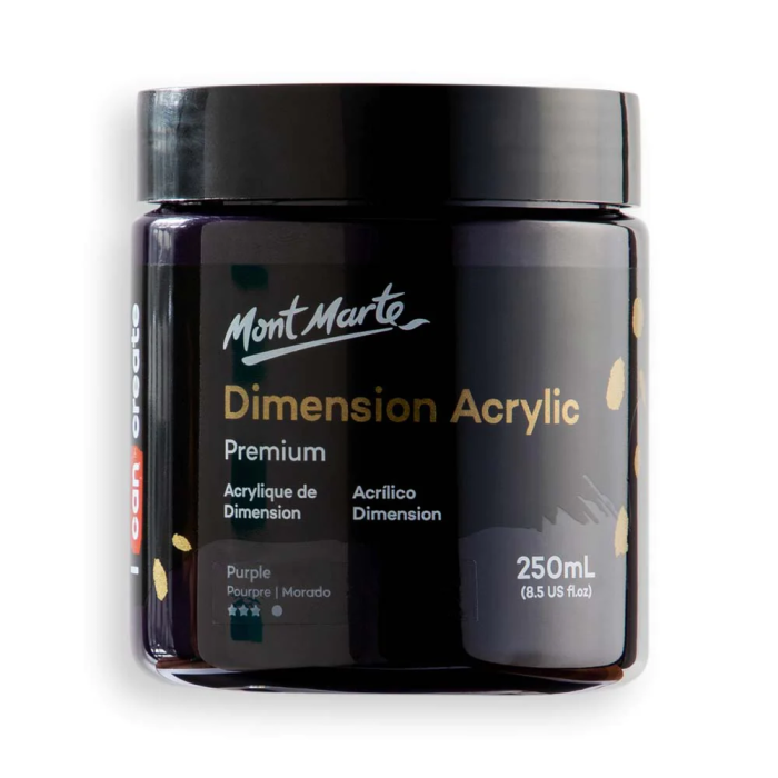 Mont Marte Premium Dimension Acrylic is a high viscosity fine art paint that offers artists a new dimension in painting. This acrylic's ultra thick consistency can be applied with brush, palette knife or shaper to create especially exaggerated texture effects.Dries hard and holds shape while still maintaining flexibility and smooth flow-ability. It can be diluted with water or acrylic mediums for glazing or watercolour techniques. With dilution, the pigment still holds strong colour intensity. Excellent lightfastness and premium quality pigment means colour strength will stay brilliant for longer. The series is available in a range of vivid colours which dry to a radiant gloss finish.