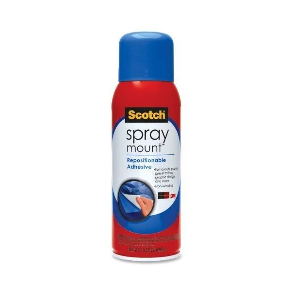 Spray Mount™ Adhesive is a repositionable spray adhesive, excellent for layouts, posters, presentations, graphic designs, and more. Bonds most acetate, foils, fabrics, light tissues, and newsprint. Convenient and versatile. Light spray allows repositioning, while a heavier spray allows a stronger bond. Quick tack, non-wrinkling, and resists bleed-through.